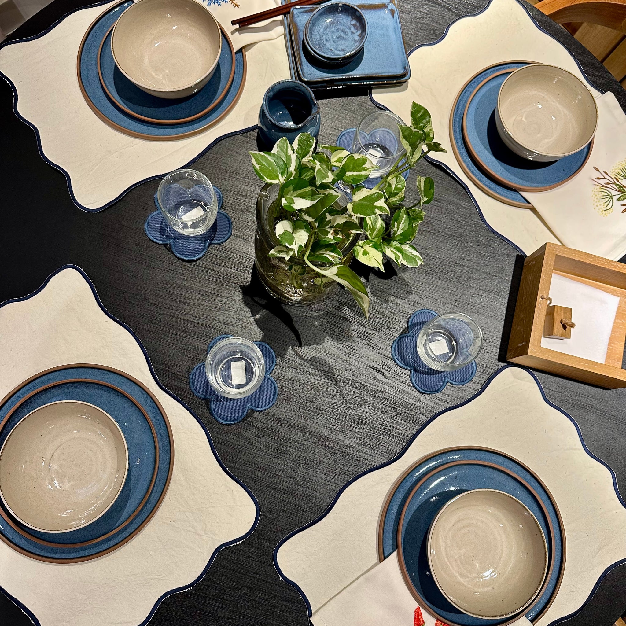 SET DE SERVILLETAS AZULES BORDADAS - FLOR DE CELOSIA (PACK DE 4)