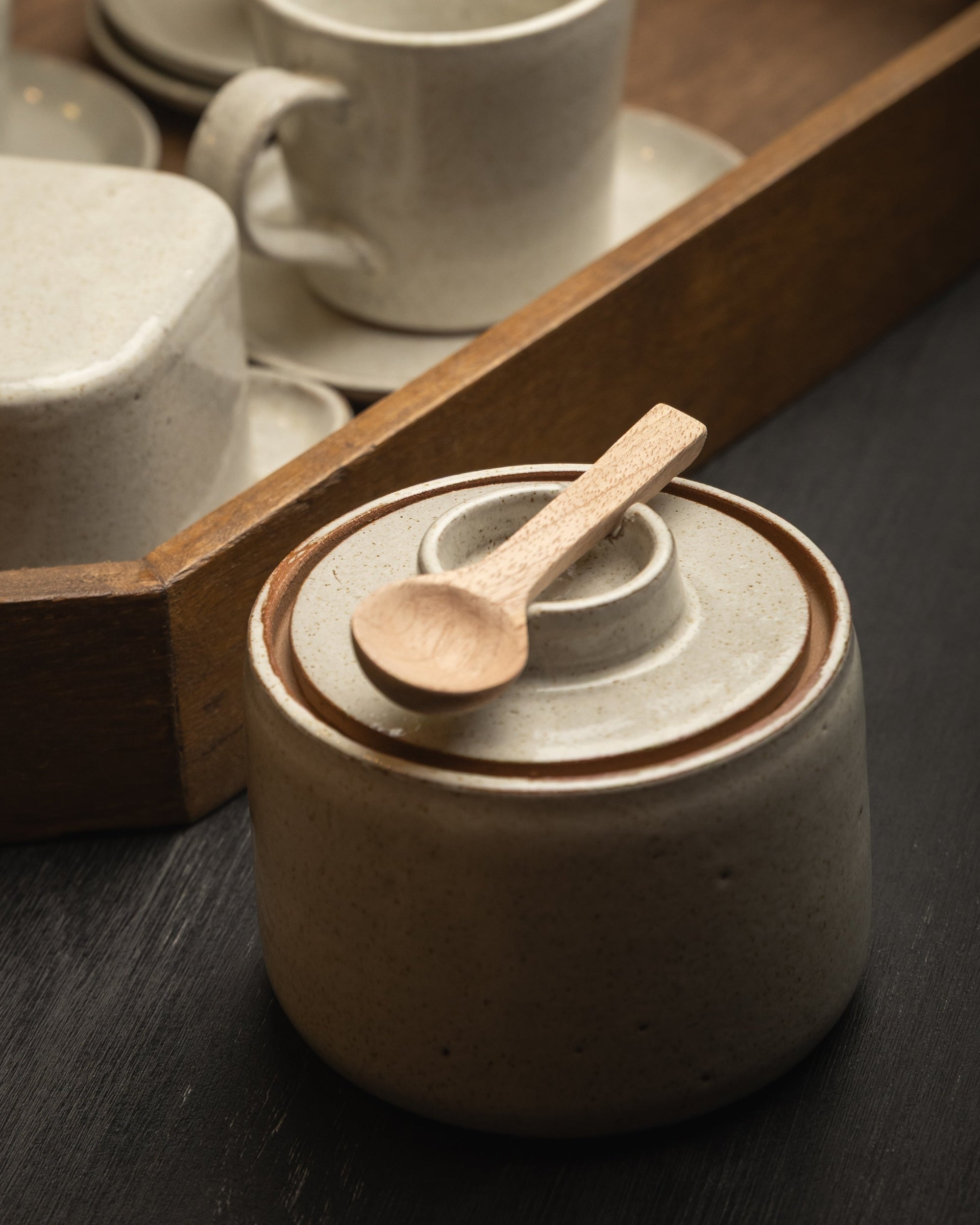 El azucarero de cerámica artesanal forma parte de nuestra colección de vajillas Arena, con una cuchara de madera que aporte un detalle que une calidez y practicidad. Perfecto para endulzar tus momentos cotidianos, se integra armónicamente con nuestra colección de tazas y platos, aportando naturalidad y elegancia a la mesa.