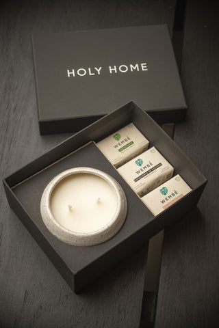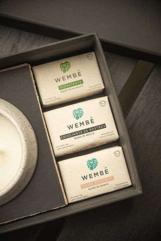 CAJA DE VELA AROMÁTICA EN CERÁMICA + TRÍO DE JABONES WEMBÉ