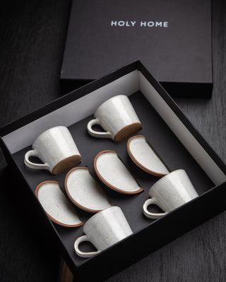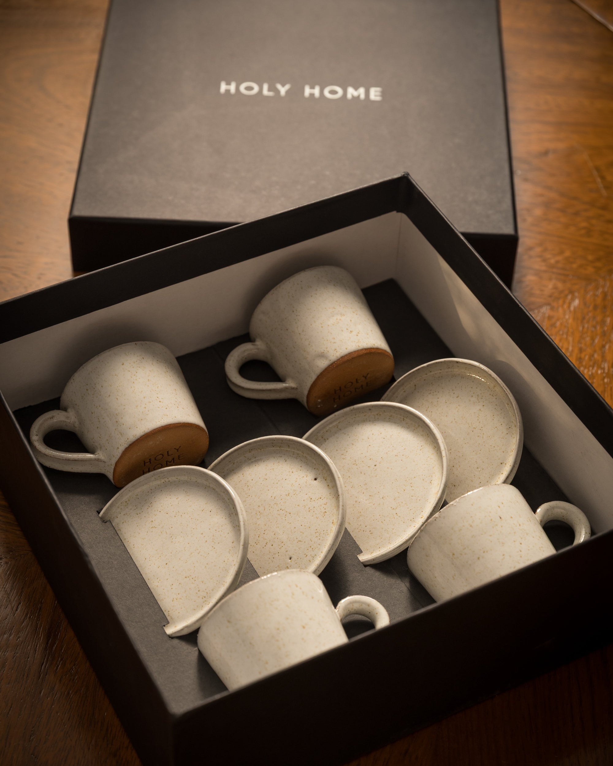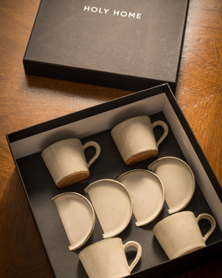 Nuestro set de tazas espresso de cerámica artesanal se presenta en la caja premium HOLY HOME, diseñada especialmente para regalar momentos y experiencias únicas. Cada pieza, hecha a mano con dedicación y materiales nobles, se convierte en un objeto que transmite calidez y autenticidad.