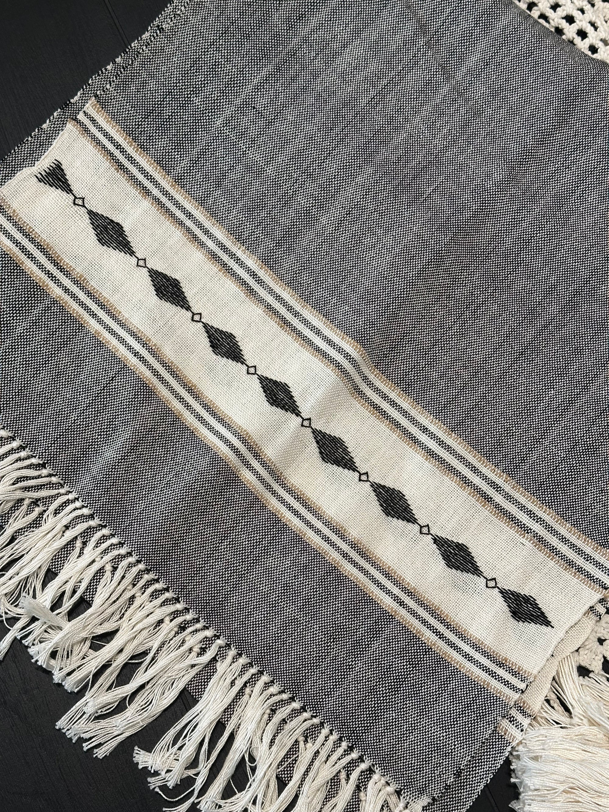 Sobre el producto: Textil de auténtico tejido de telar AO PO'I de algodón bordado con puntos de ao po'i y vainillas en los extremos, hechos a mano desde la cosecha y la fabricación de hilos a mano hasta la elaboración en telar.