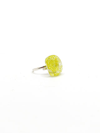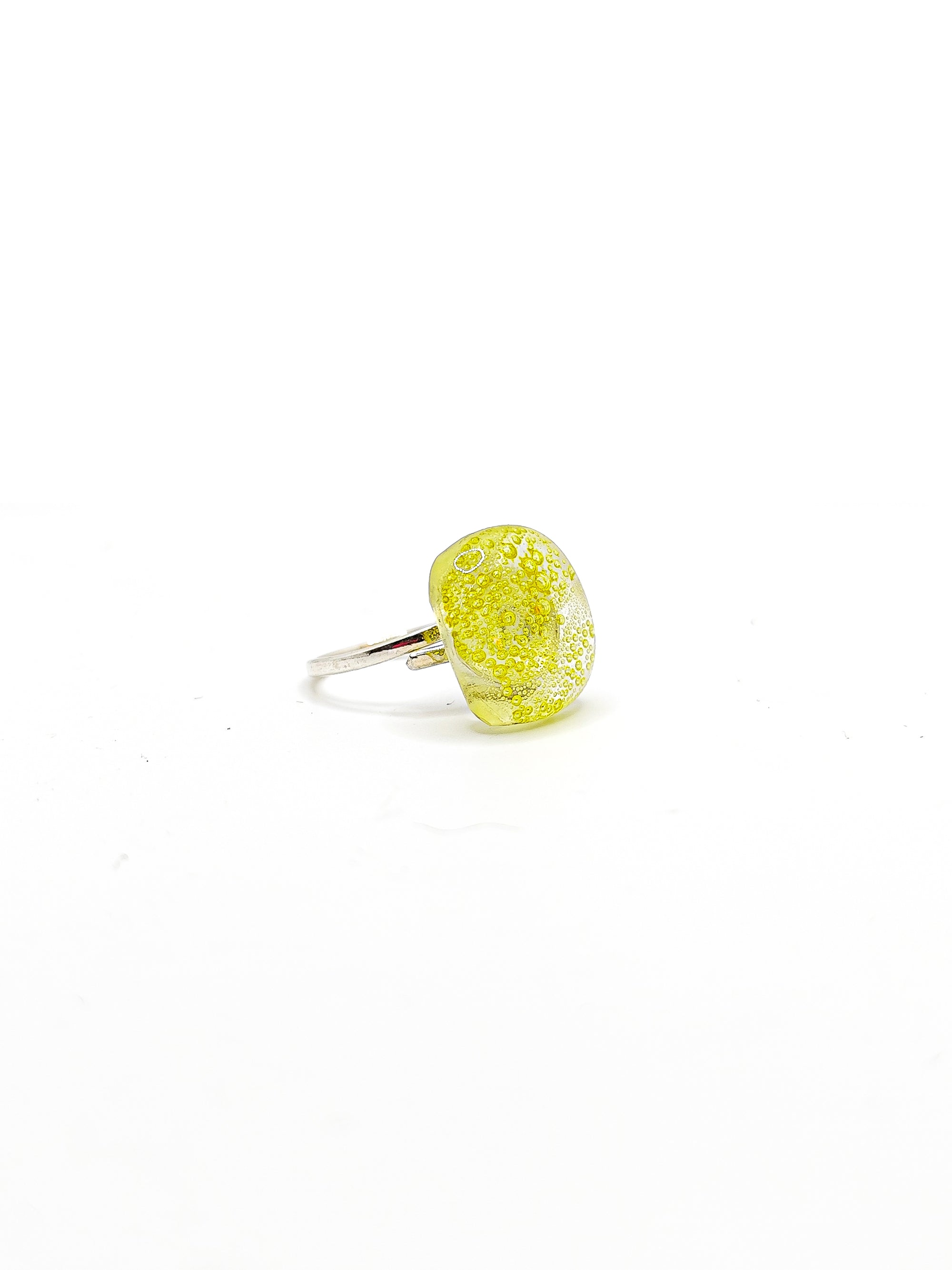 El Anillo Bloom Color Amarillo de Evergreen ofrece un diseño moderno y sofisticado, con una pieza central Cuadrado de vidrio reciclado, trabajada de forma artesanal y montada en plata .925, ideal para quienes buscan elegancia con propósito.