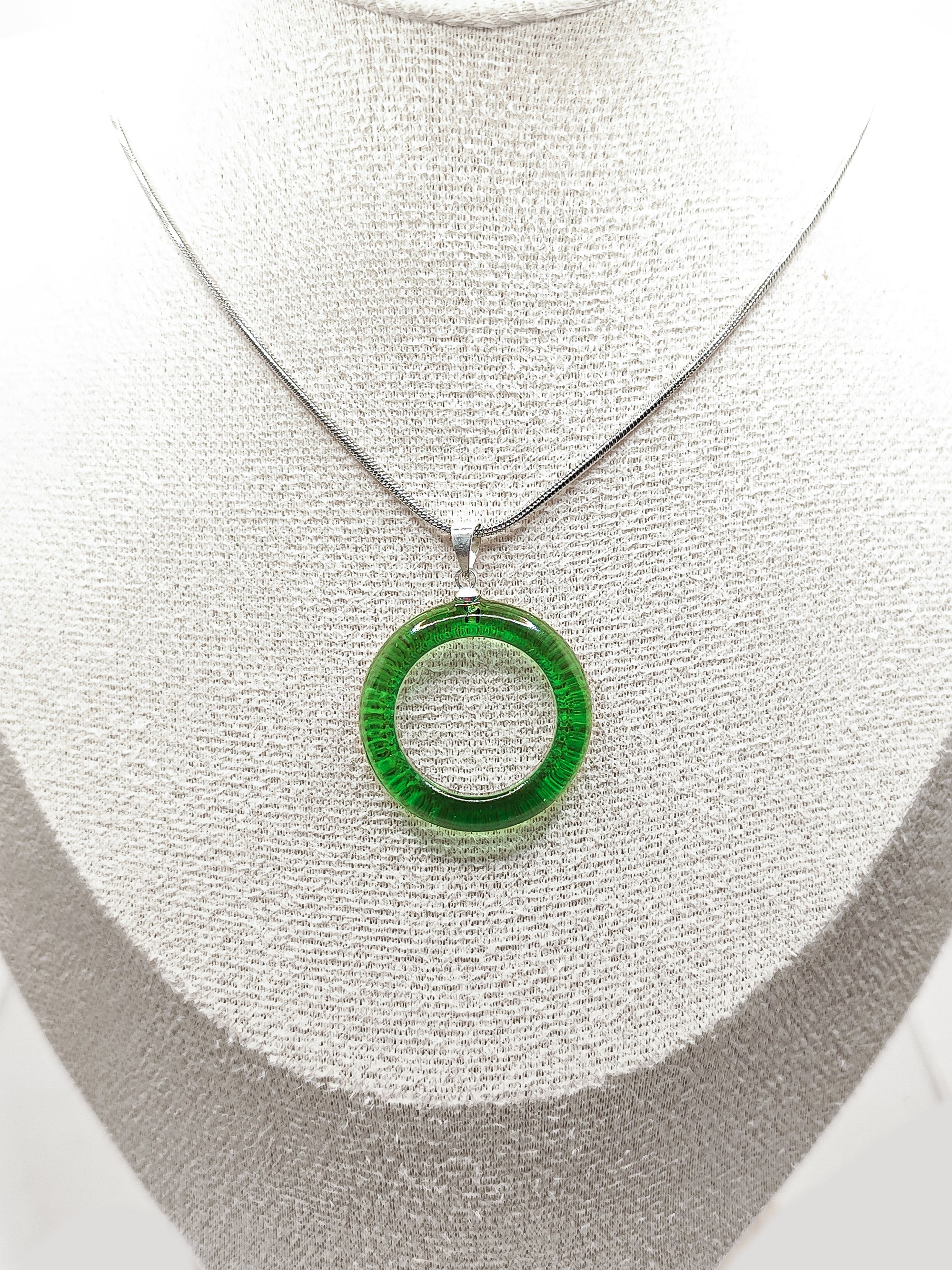 El Collar Eternal Color Verde Heinecken de Evergreen ofrece un diseño moderno y sofisticado, con una pieza central Circular de vidrio reciclado, trabajada de forma artesanal y montada en plata .925, ideal para quienes buscan elegancia con propósito.