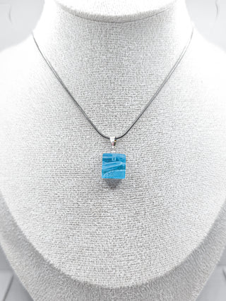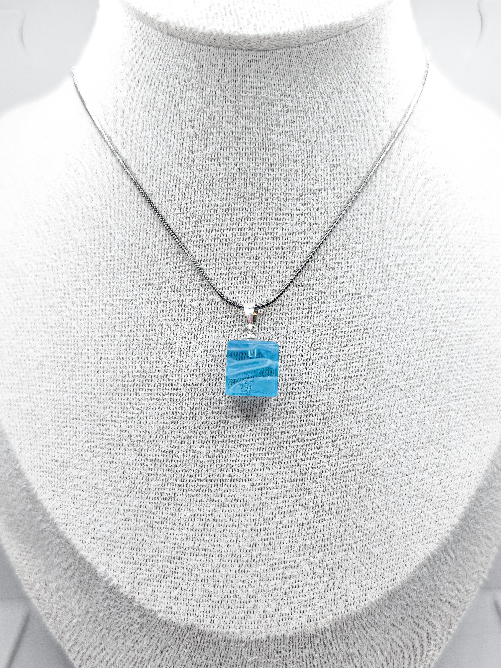 El Collar Vitrae Color Celeste Bombay de Evergreen ofrece un diseño moderno y sofisticado, con una pieza central Cubo de vidrio reciclado, trabajada de forma artesanal y montada en plata .925, ideal para quienes buscan elegancia con propósito.