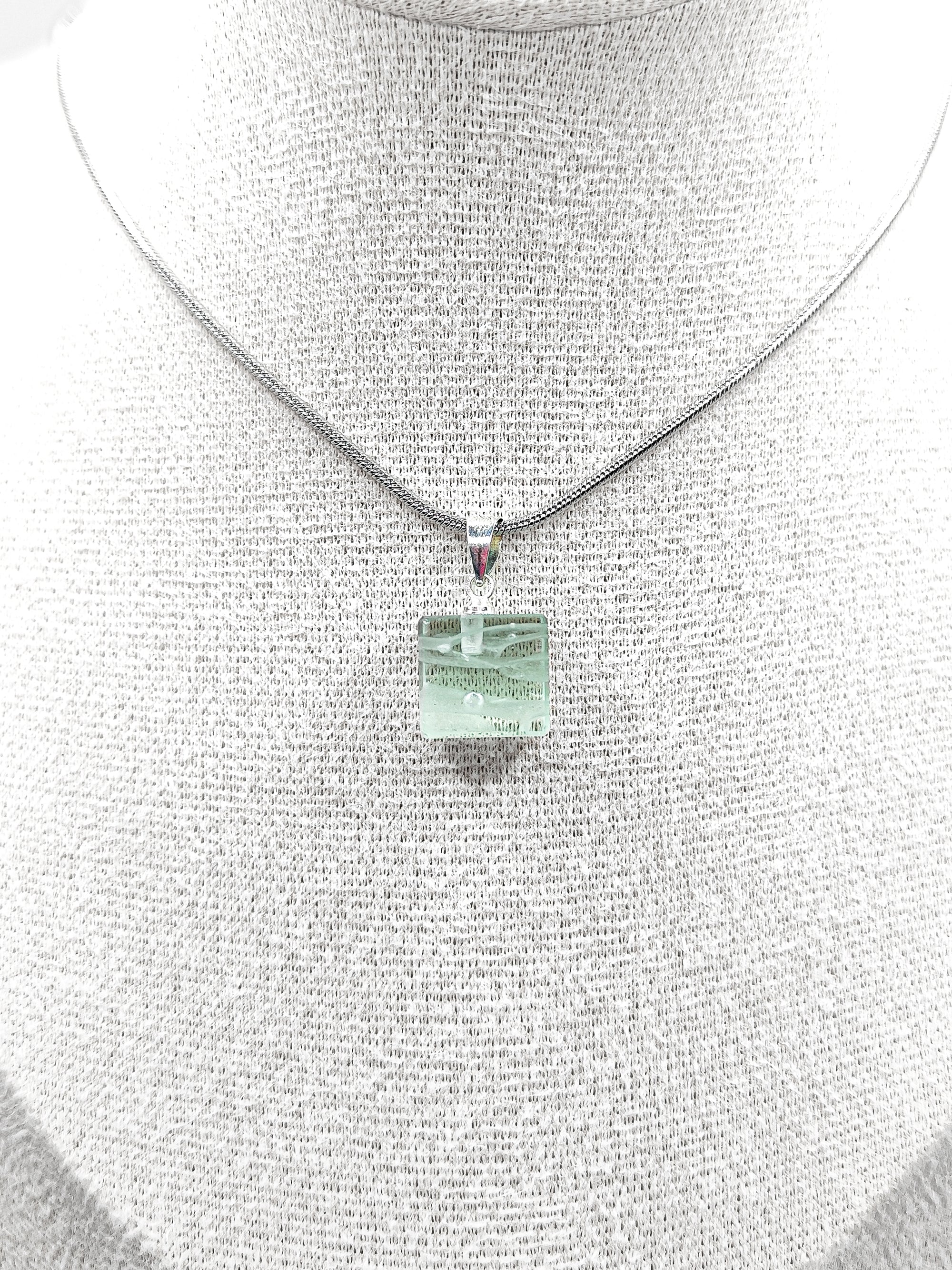El Collar Vitrae Color Transparente de Evergreen ofrece un diseño moderno y sofisticado, con una pieza central Cubo de vidrio reciclado, trabajada de forma artesanal y montada en plata .925, ideal para quienes buscan elegancia con propósito.
