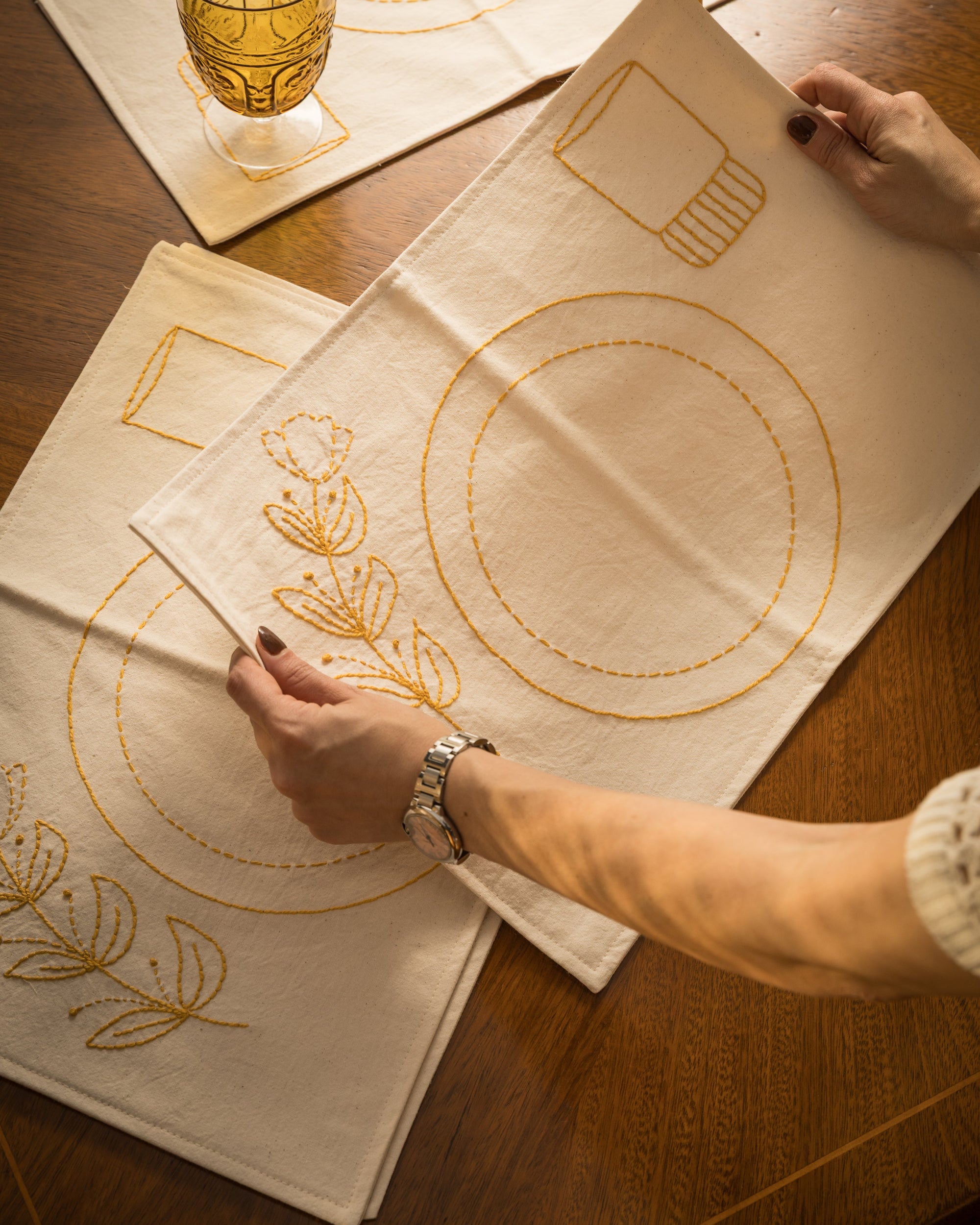 INDIVIDUALES DE ALGODÓN BORDADOS A MANO - MOSTAZA (SET DE 4)