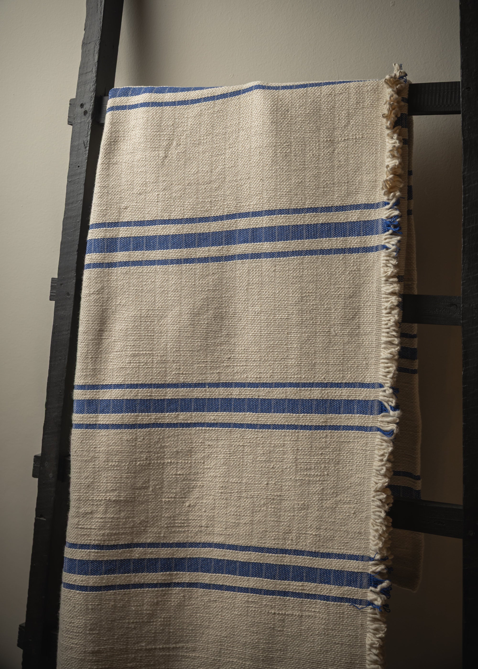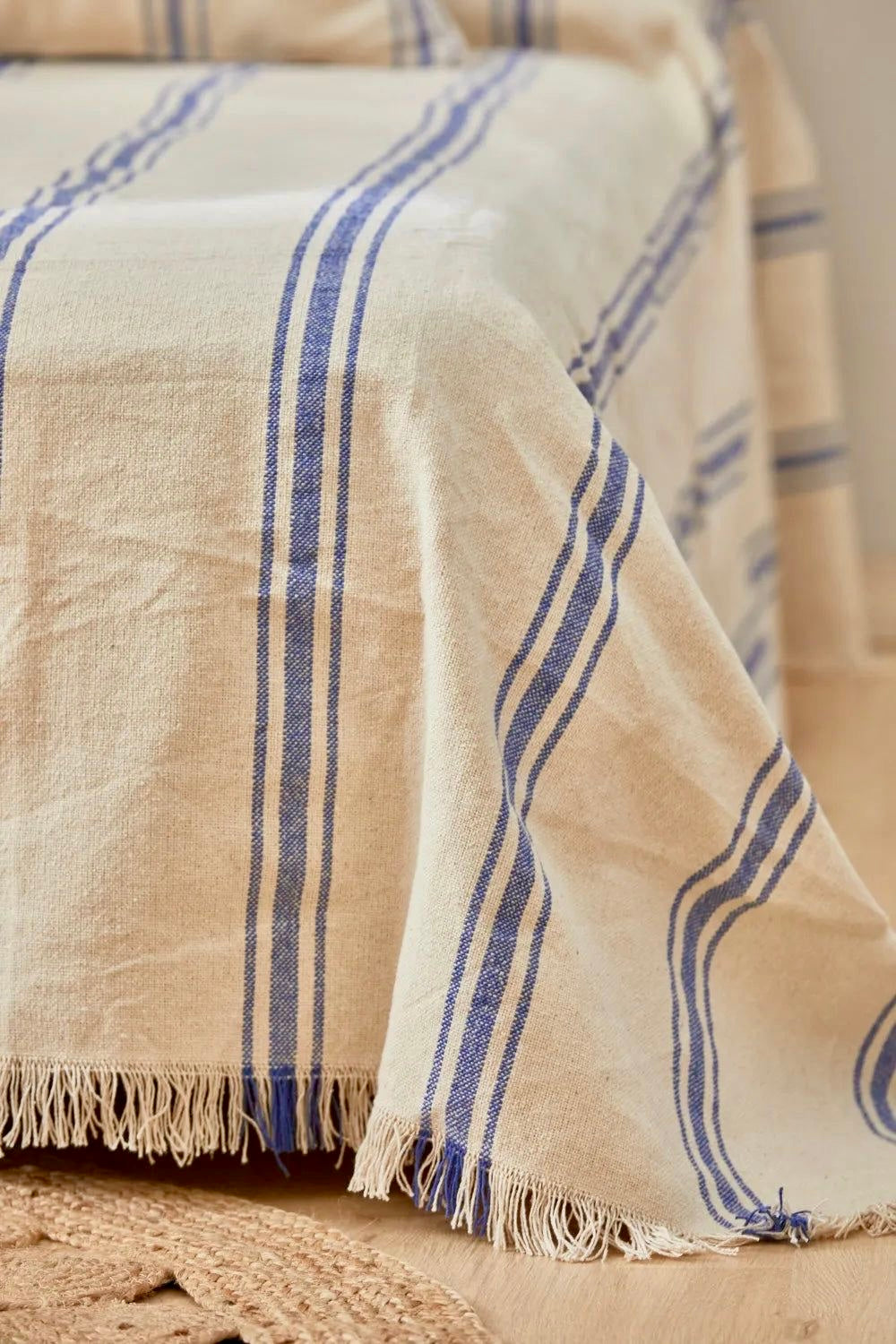 About the product: Cotton blanket in ecru tones with blue-gray stripes with fringes at the ends.