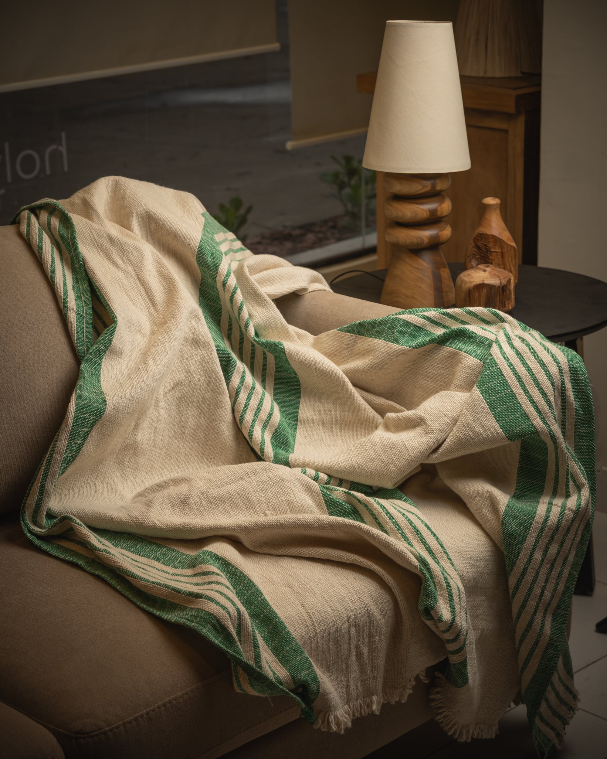 About the product: Cotton blanket in ecru tones with mustard lines and fringes at the ends.