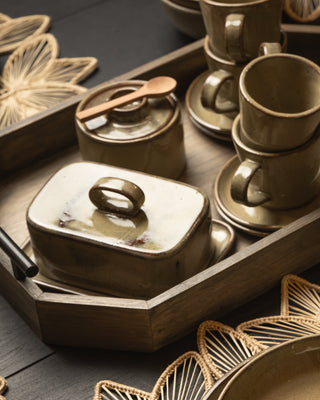 La mantequera de nuestra colección Oliva de vajilla artesanal combina diseño funcional y encanto atemporal. Hecha a mano en cerámica, es el complemento ideal para llevar a la mesa con estilo, manteniendo la manteca fresca y lista para acompañar desayunos, meriendas o cenas especiales.