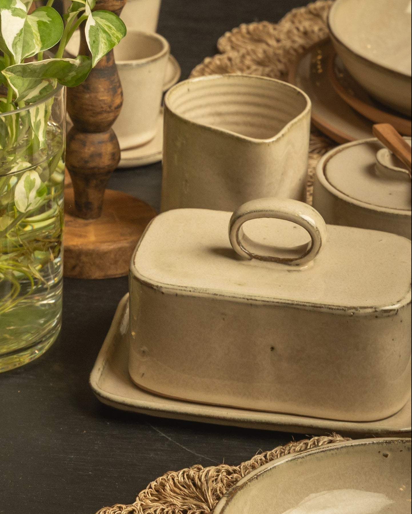 La mantequera de nuestra colección Crema de vajilla artesanal combina diseño funcional y encanto atemporal. Hecha a mano en cerámica, es el complemento ideal para llevar a la mesa con estilo, manteniendo la manteca fresca y lista para acompañar desayunos, meriendas o cenas especiales.
