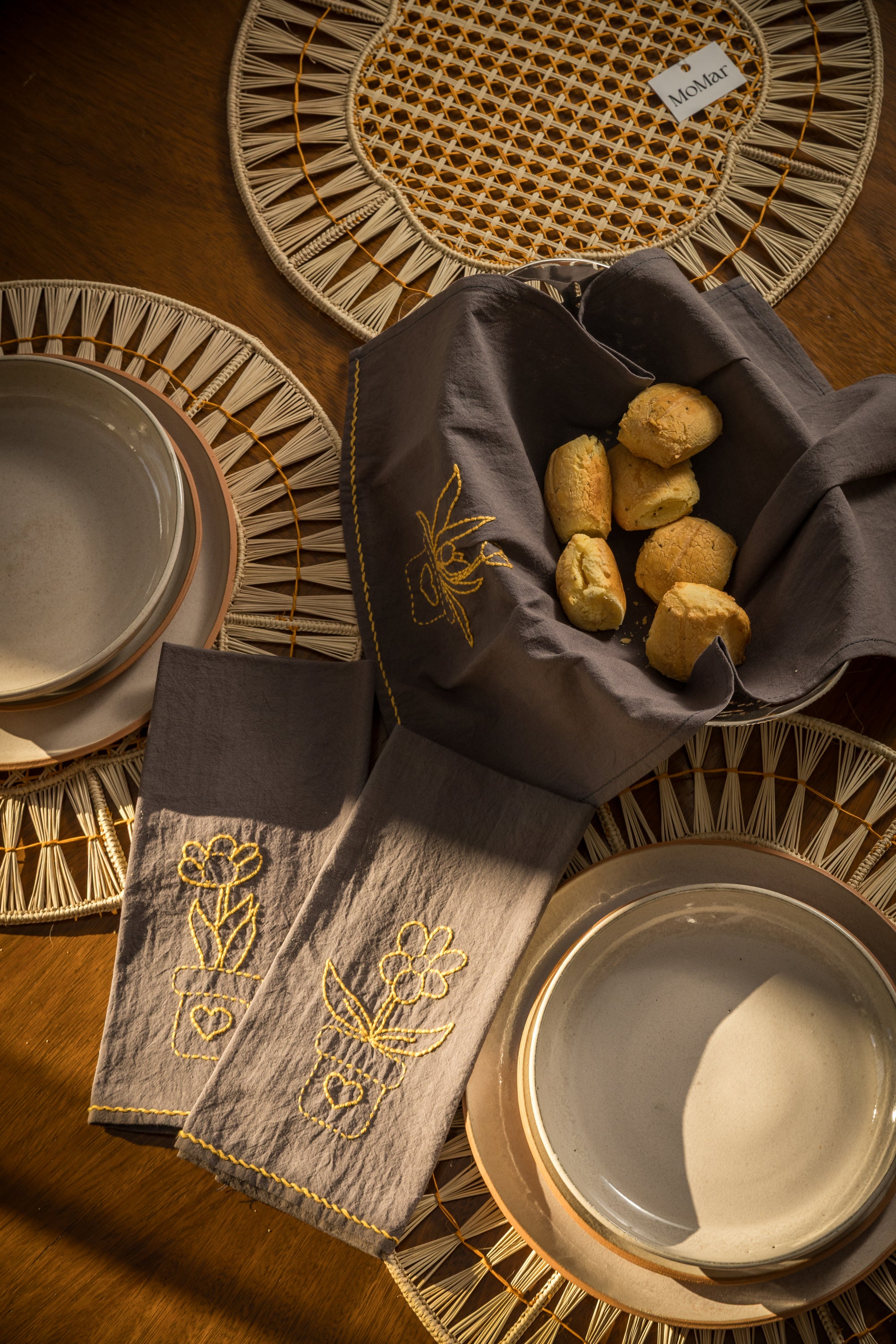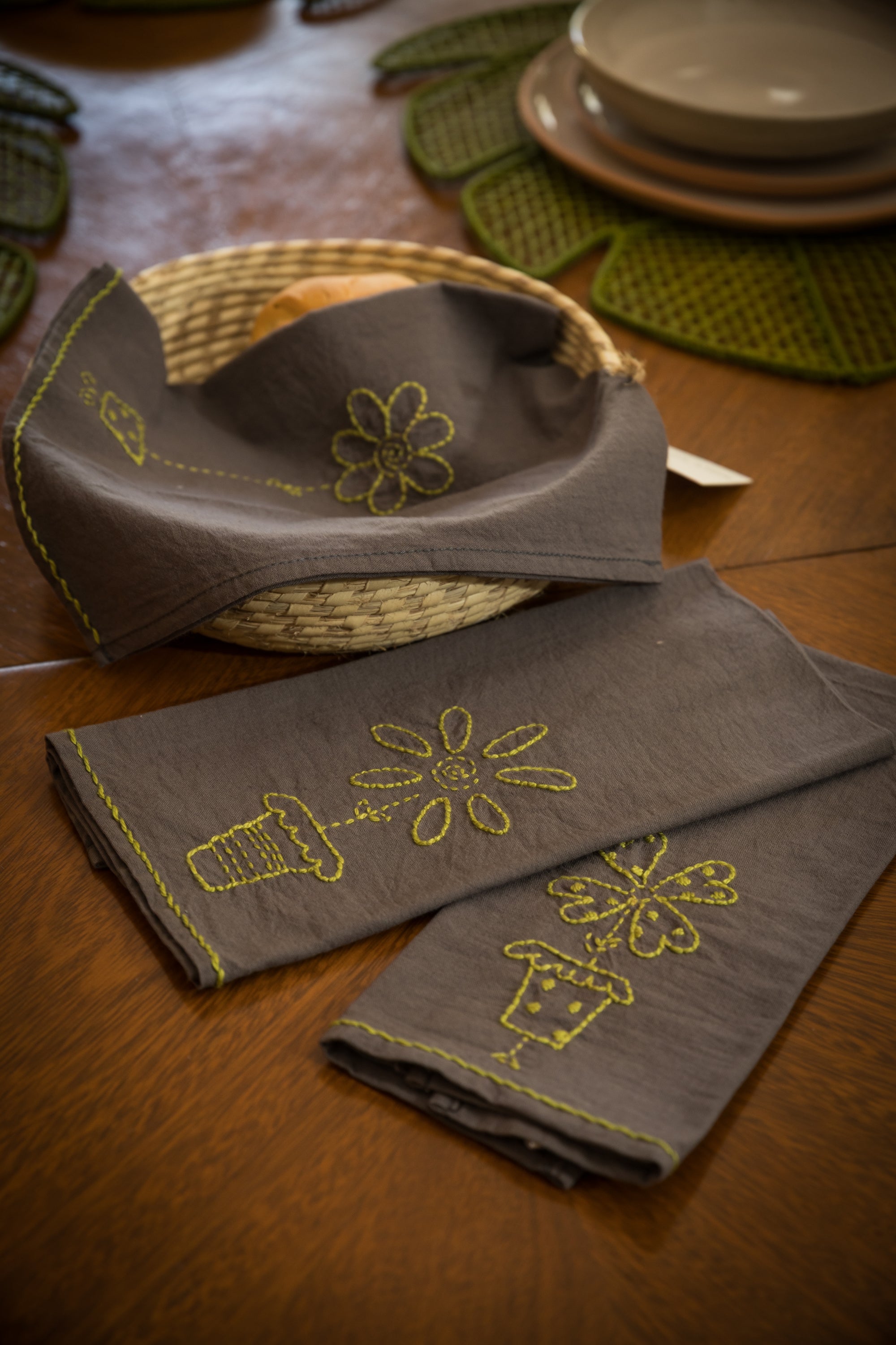 PAÑOS DE COCINA DE TUSOR DE ALGODON BORDADOS A MANO - FLORES (SET DE 3)