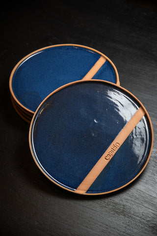 Platos redondos de cerámica artesanal esmaltada con logo personalizado.