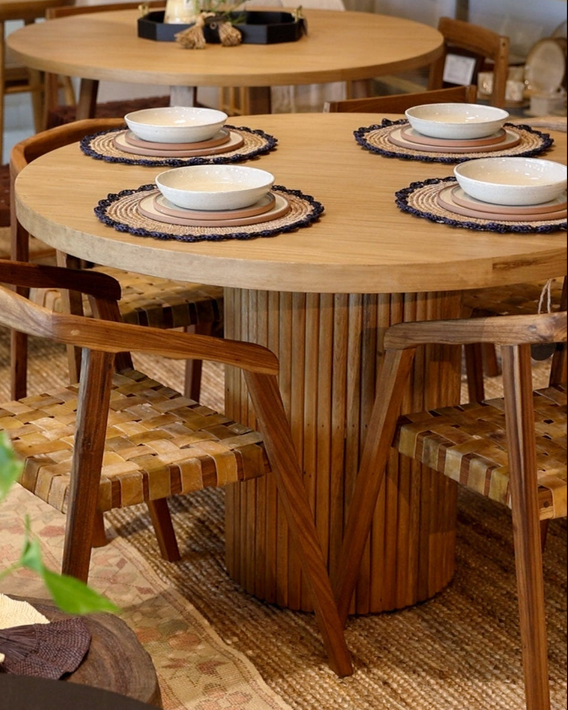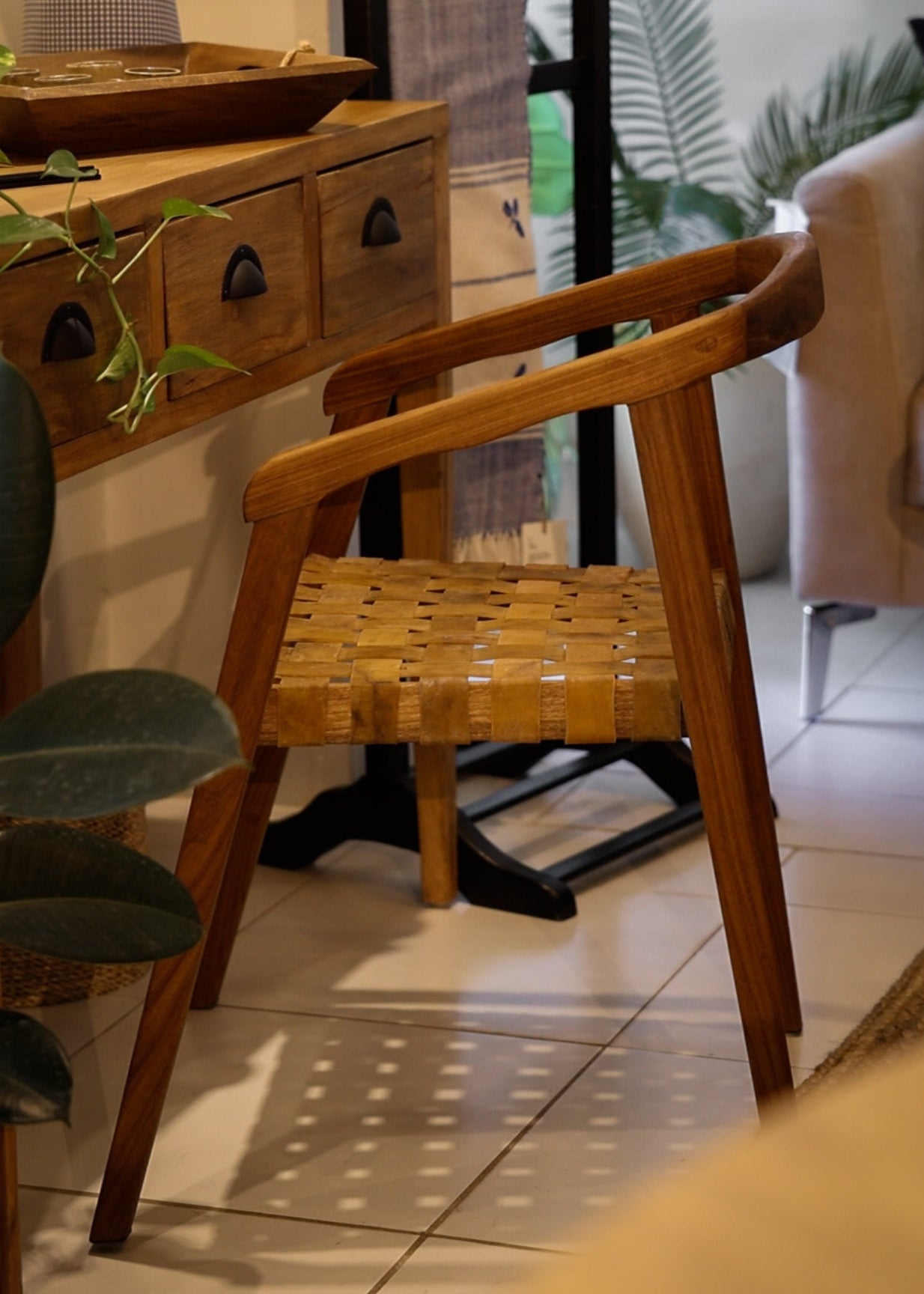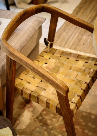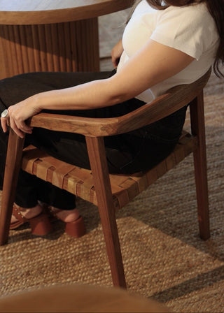 El asiento trenzado en cuero genuino, elaborado de manera manual, aporta textura, autenticidad y una estética atemporal que conecta con lo esencial. Cada pieza es única, con variaciones propias del material que realzan su valor artesanal.