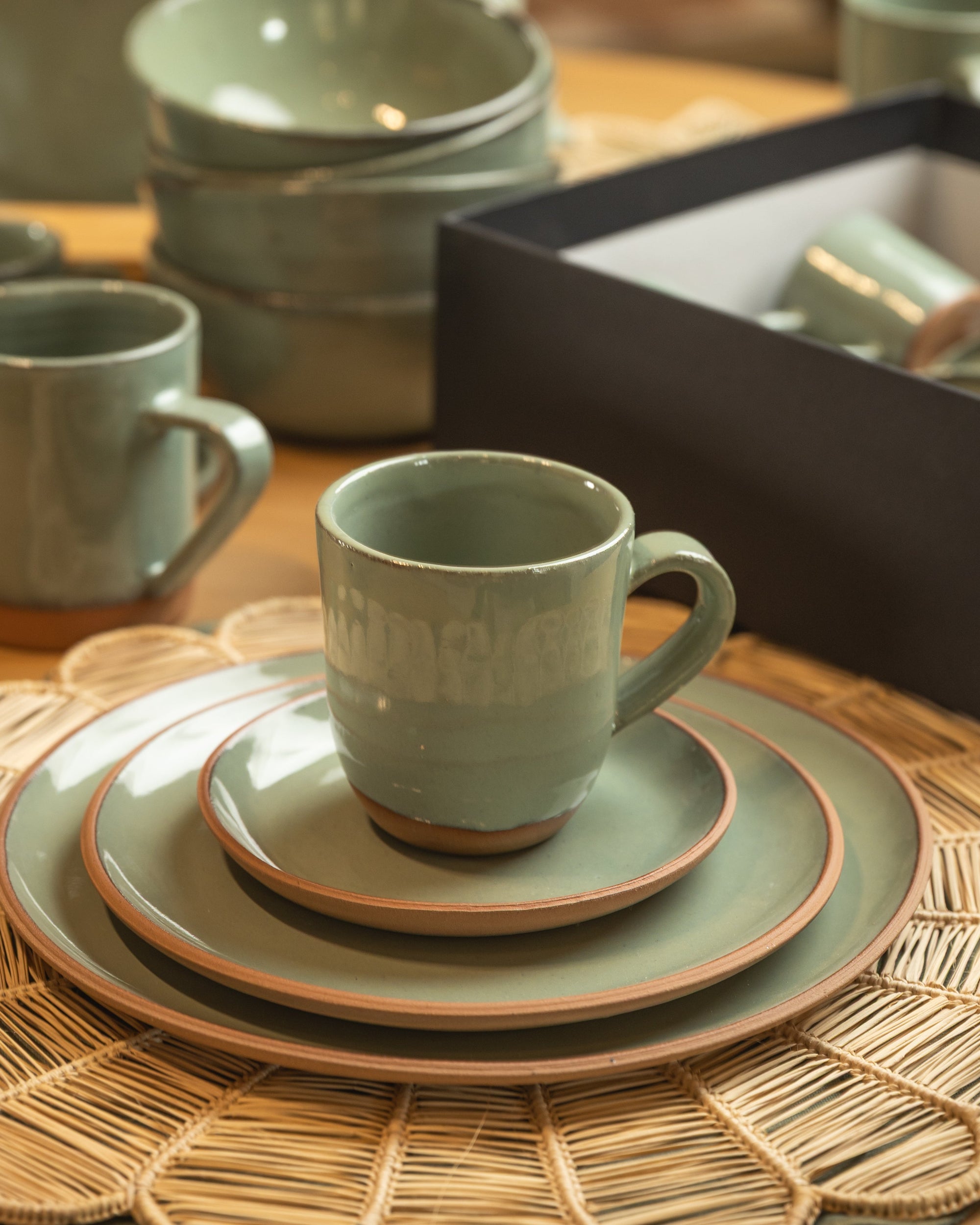 Nuestro set de tazas Laurel, destaca en un tono verde sutil pero con carácter consta de 4 tazas y 4 platitos de cerámica esmaltada acabado brilloso y base natural que combina diseño y calidez en una pieza de cerámica artesanal pensada para acompañarte en ese momento especial del día. Hecha a mano con arcillas y esmaltes no tóxicos, aptos para consumo de alimentos. Cada pieza es única y lleva consigo el encanto de lo auténtico.